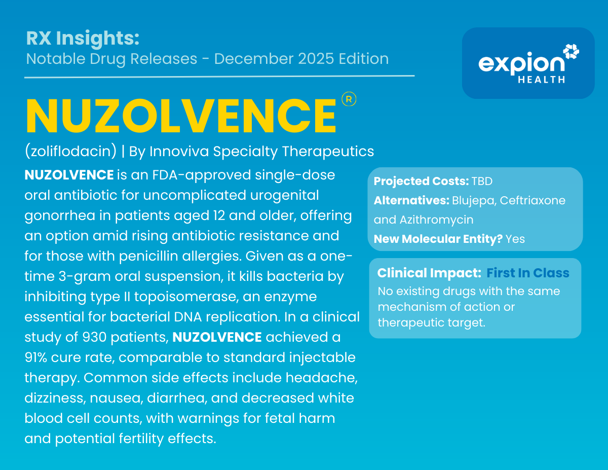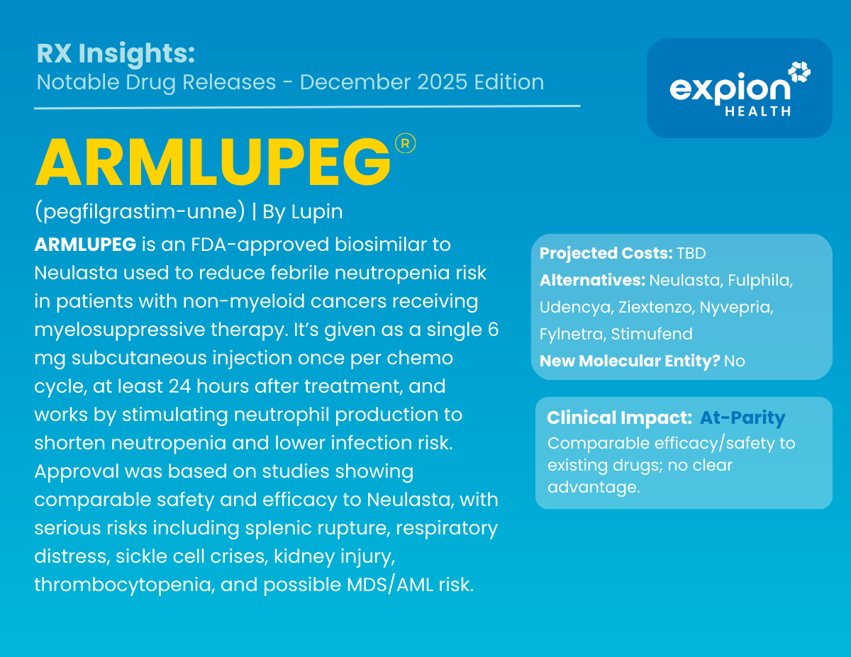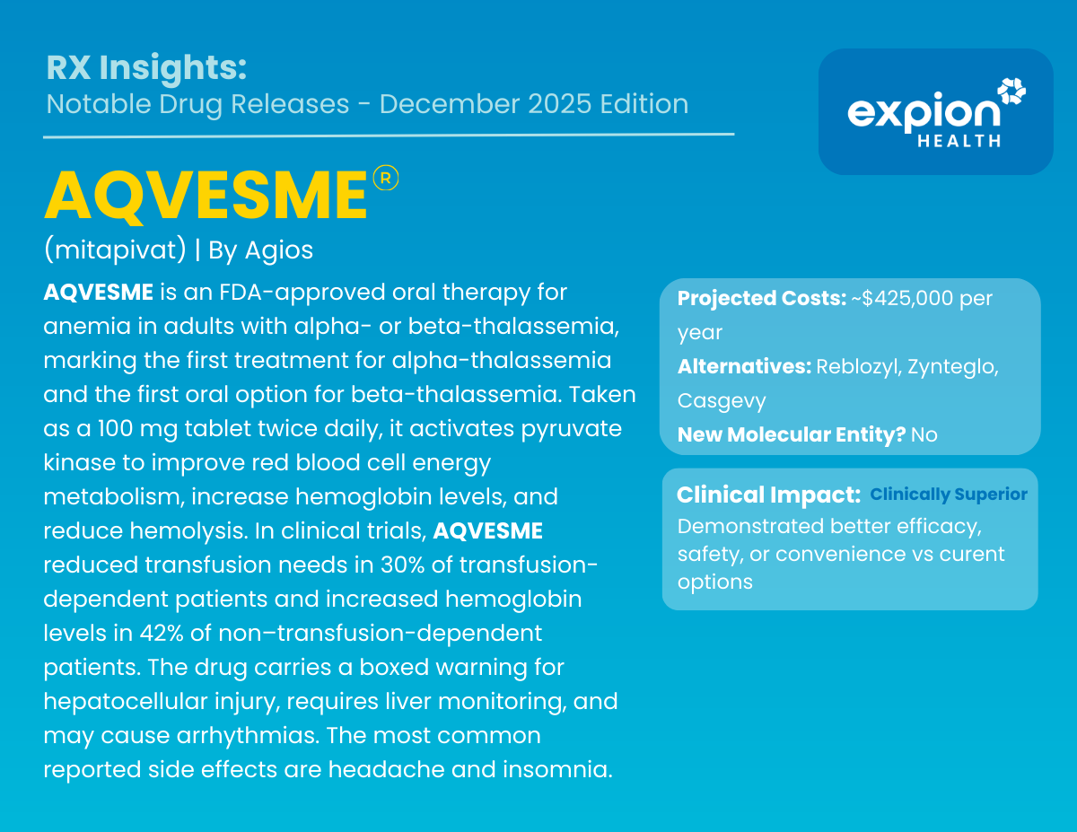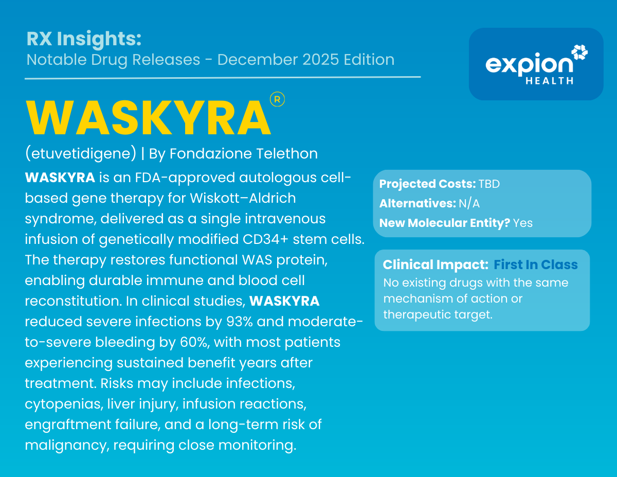 This month’s edition provides a focused review of newly approved and recently launched therapies. Expion Health monitors these developments closely to assess clinical relevance, therapeutic positioning, and potential implications for payers, providers, and patients.