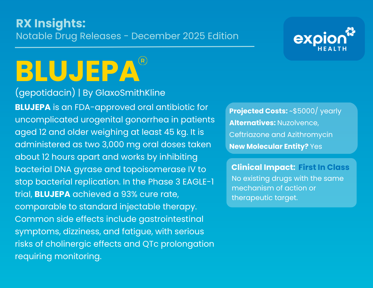 BLUJEPA (gepotidacin) is FDA approved for the treatment of uncomplicated urogenital gonorrhea in adults and pediatric patients aged 12 years and older who weigh at least 45 kg (99 pounds).