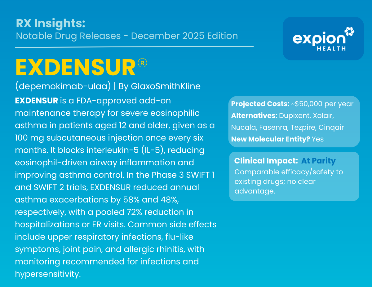 EXDENSUR (depemokimab-ulaa) is FDA approved as an add-on maintenance treatment for severe asthma with an eosinophilic phenotype in patients 12 years of age and older.