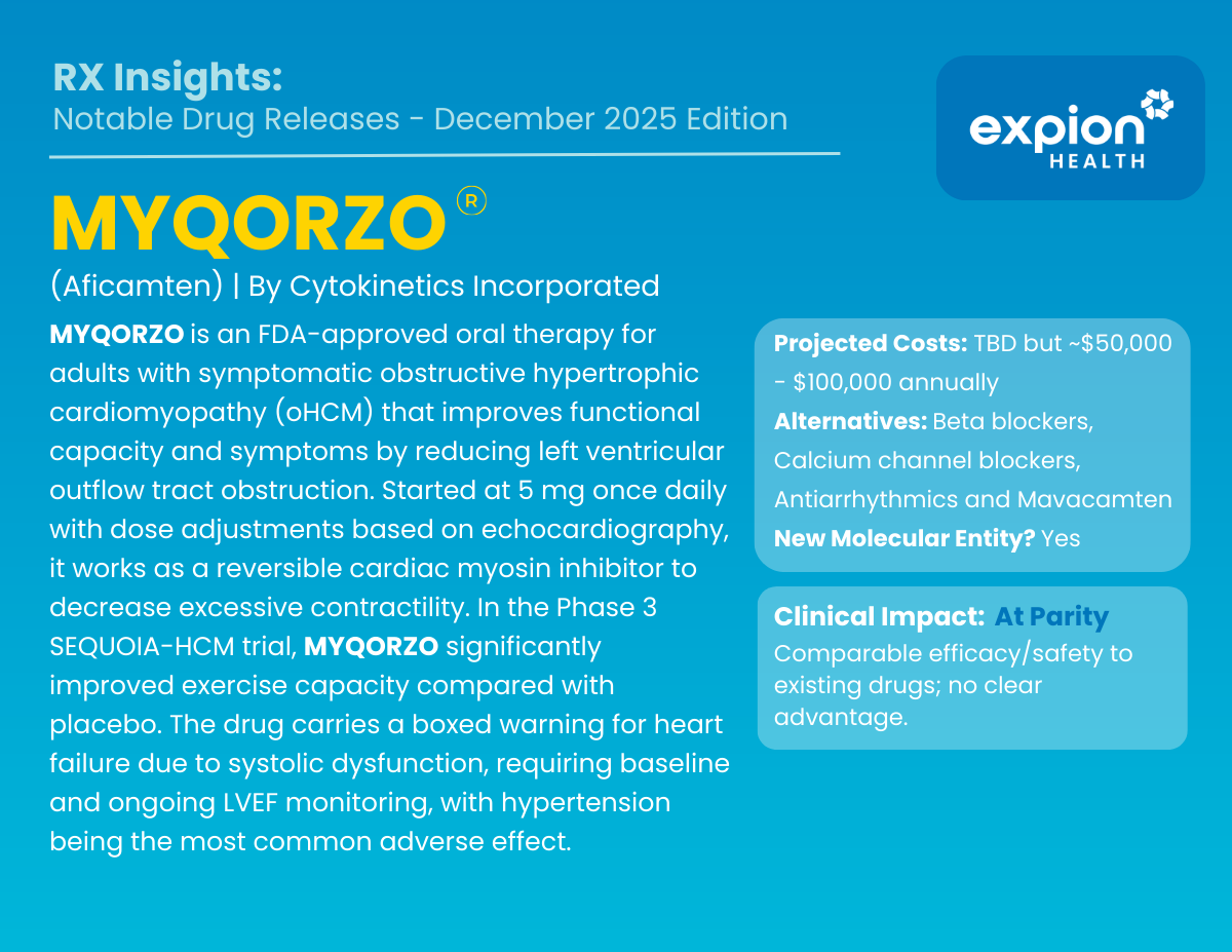MYQORZO (aficamten) is indicated for the treatment of adults with symptomatic obstructive hypertrophic cardiomyopathy (oHCM) to improve functional capacity and symptoms.