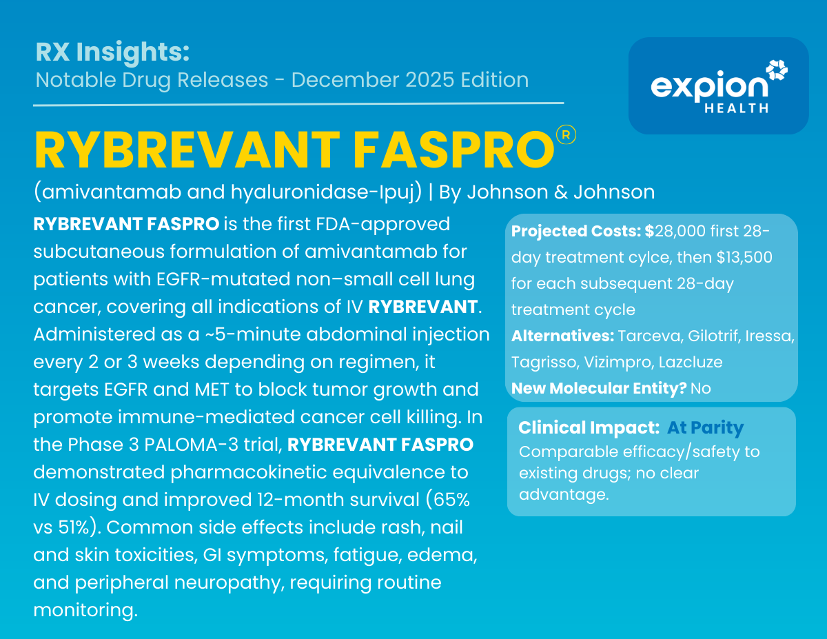 RYBREVANT FASPRO (amivantamab and hyaluronidase-lpuj) is FDA approved as the first and only subcutaneously administered therapy for patients with epidermal growth factor receptor (EGFR)–mutated non–small cell lung cancer (NSCLC). It has been approved to align with all indications of RYBREVANT.