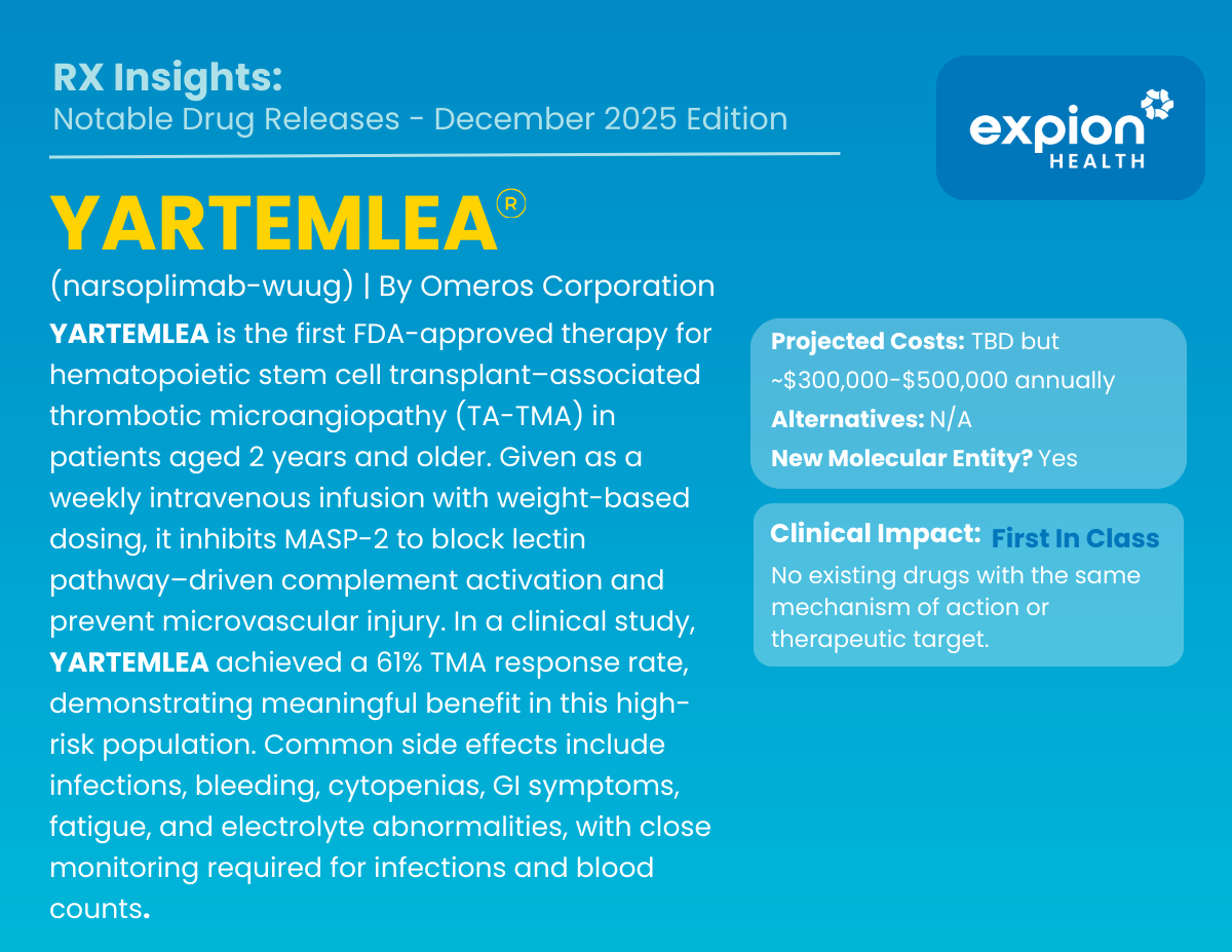 YARTEMLEA (narsoplimab-wuug) is the first FDA-approved treatment for hematopoietic stem cell transplant–associated thrombotic microangiopathy (TA-TMA) in adult and pediatric patients aged 2 years and older.