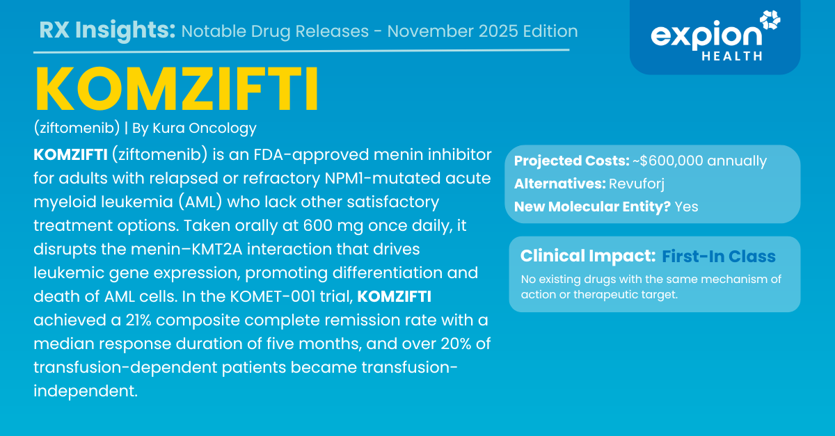 FDA approval was based on the KOMET-001 open-label, single-arm, multicenter trial in 112 adults with relapsed or refractory NPM1-mutated AML. The composite complete remission (CR + CRh) rate was 21.4%, with a median remission duration of five months. Additionally, 21.2% of patients who were transfusion-dependent at baseline achieved transfusion independence during therapy. Responses typically occurred within the first few treatment cycles and were observed across patients with diverse prior therapies, supporting KOMZIFTI as an important targeted option for this genetically defined subset of AML.