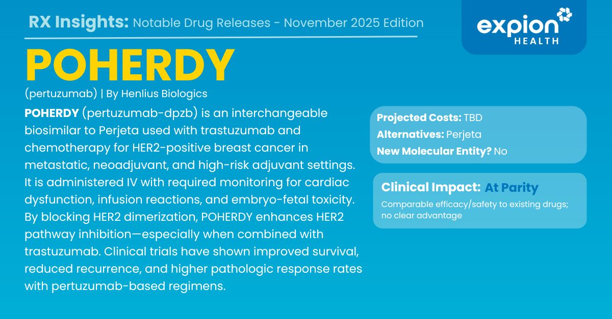 POHERDY (pertuzumab-dpzb) is an FDA-approved interchangeable biosimilar to Perjeta for the treatment of HER2-positive breast cancer. It is indicated for use in combination with trastuzumab and docetaxel for first-line HER2-positive metastatic disease; as neoadjuvant therapy with trastuzumab and chemotherapy for locally advanced, inflammatory, or early-stage tumors >2 cm or node-positive; and as adjuvant therapy for early breast cancer at high risk for recurrence.