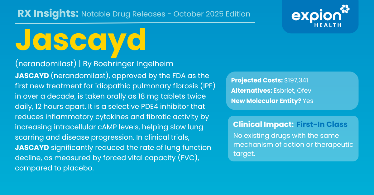 JASCAYD (nerandomilast) is approved by the FDA for the treatment of idiopathic pulmonary fibrosis (IPF), a rare, progressive, and life-threatening lung disease with limited treatment options. It is the first new therapy approved for IPF in more than a decade.